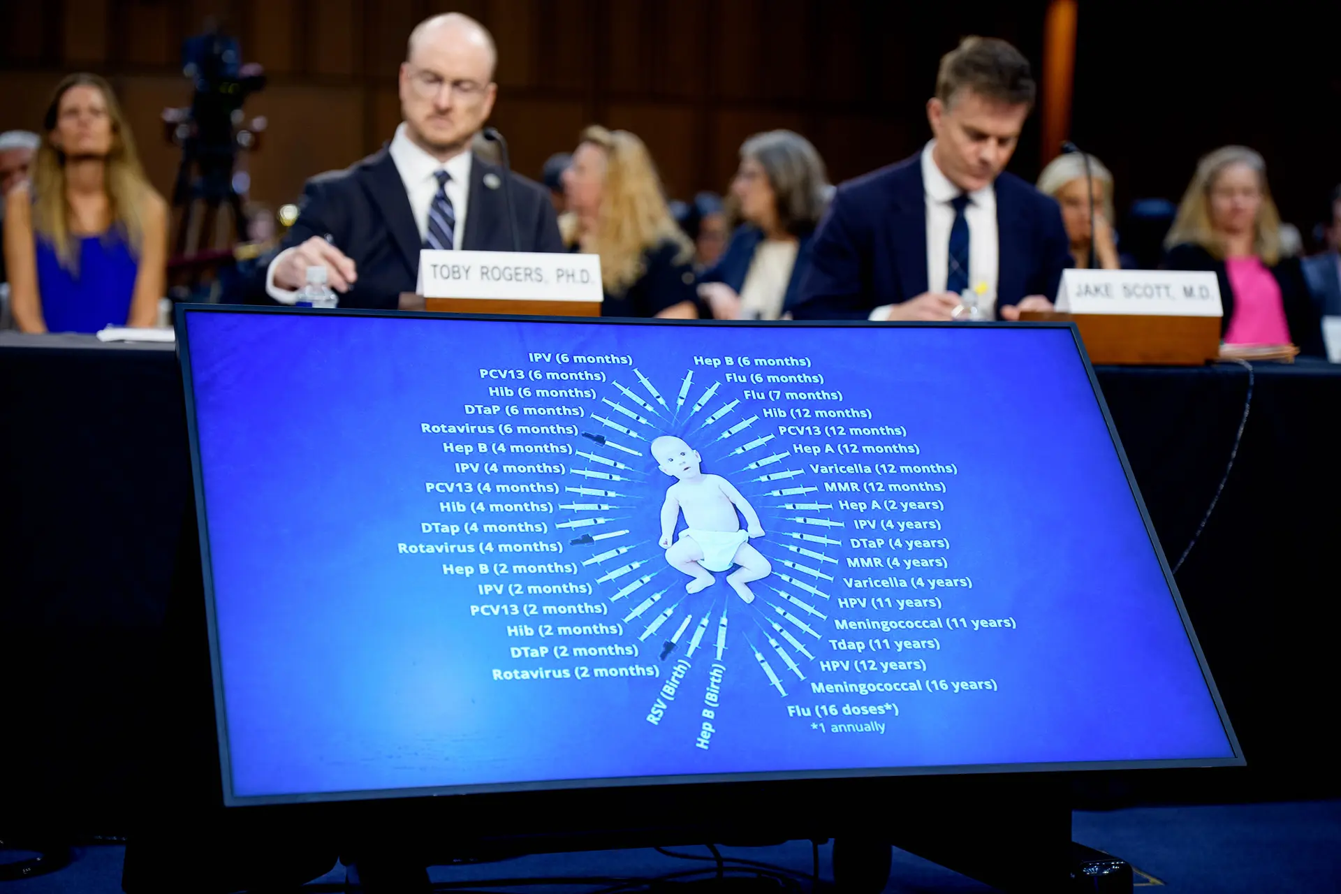 Un niño rodeado de una lista de vacunas aparece en un monitor durante una audiencia del Senado en Washington el 9 de septiembre de 2025. (Andrew Harnik/Getty Images).“Esta legislación tiene como objetivo proteger a los niños, proteger las aulas y proteger a las comunidades con normas claras y con base médica”, dijo Bright Matthews, demócrata, en un comunicado.