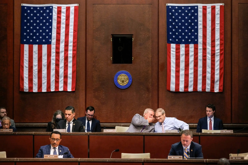 El presidente del Comité de Supervisión y Reforma Gubernamental de la Cámara de Representantes, James Comer (R-Ky.), y el representante Jim Jordan (R-Ohio) conversan durante una audiencia sobre un presunto fraude en Minnesota, en el Capitolio de los Estados Unidos, el 7 de enero de 2026. Los fiscales federales han acusado a decenas de personas en el estado, muchas de ellas de la comunidad somalí, en un plan que involucra miles de millones en servicios sociales financiados por los contribuyentes. (Chip Somodevilla/Getty Images)El fraude en Minnesota se estima en miles de millones