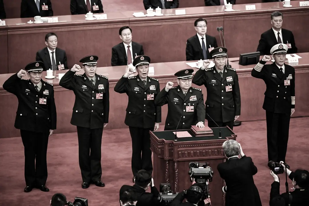 Zhang Youxia (delante) presta juramento junto con los miembros de la Comisión Militar Central tras su elección durante la cuarta sesión plenaria de la Asamblea Popular Nacional en el Gran Salón del Pueblo de Beijing el 11 de marzo de 2023. (Greg Baker/POOL/AFP a través de Getty Images)Reacción dentro de las filas