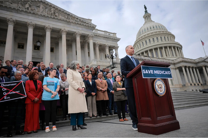 El líder de la minoría de la Cámara de Representantes, Hakeem Jeffries (D-N.Y.), acompañado por sus compañeros demócratas, habla en contra del proyecto de ley de presupuesto republicano afuera del Capitolio de Estados Unidos el 25 de febrero de 2025. Los demócratas generalmente están a favor de una mayor intervención gubernamental en forma de regulación y subsidios con el objetivo de garantizar el acceso a los servicios de atención médica para todos. (Chip Somodevilla/Getty Images)Los políticos y analistas de izquierdas se mostraron escépticos ante cualquier plan que ofrezca lo que consideran una cobertura sanitaria inferior a la de Obamacare, incluidos los seguros a corto plazo y los planes para catástrofes.