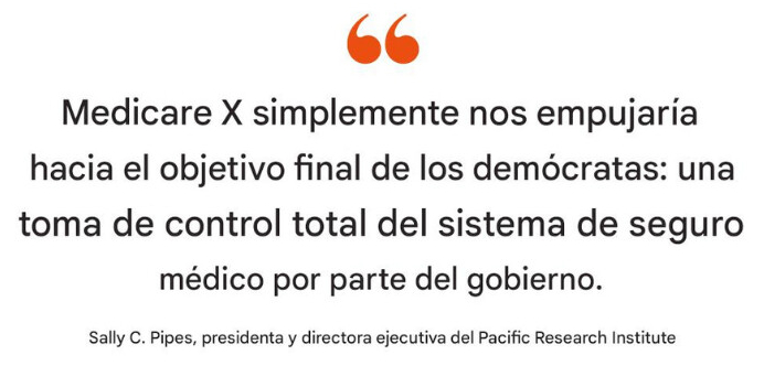 "Los demócratas dicen que solo quieren ofrecer otra opción de seguro médico. Pero Medicare X simplemente nos empujaría hacia el objetivo final de los demócratas: La toma de control total del sistema de seguros médicos por parte del gobierno", escribió Sally C. Pipes, presidenta y directora ejecutiva del Pacific Research Institute, en la página web del think tank en 2024.