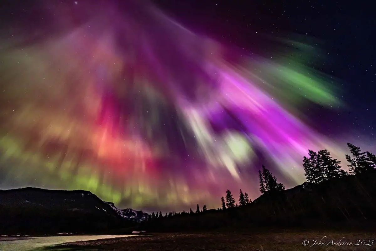 Auroras verdes y rosas vistas sobre el sur de Alberta. (Cortesía de John Andersen).El equinoccio de primavera también intensificará el fenómeno. Proporciona la inclinación óptima del eje terrestre con respecto al viento solar, maximizando la interacción entre nuestra magnetosfera y las partículas solares. Este fenómeno, conocido como efecto Russell-McPherron, es la razón por la que tenemos una temporada de auroras boreales.