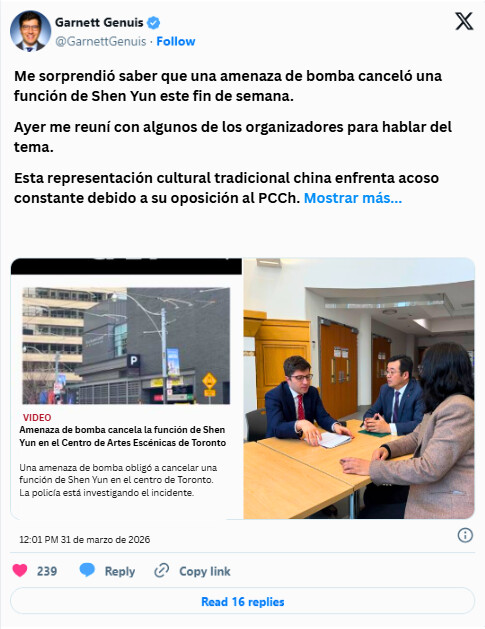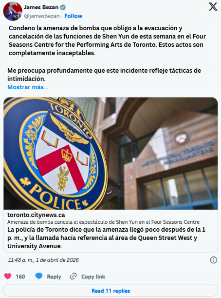 “Condeno la amenaza de bomba que obligó a la evacuación y a la cancelación de las representaciones de Shen Yun de esta semana en el Four Seasons Centre for the Performing Arts de Toronto”, declaró el diputado conservador James Bezan en un comunicado publicado en las redes sociales el 1 de abril, refiriéndose al incidente del 29 de marzo.