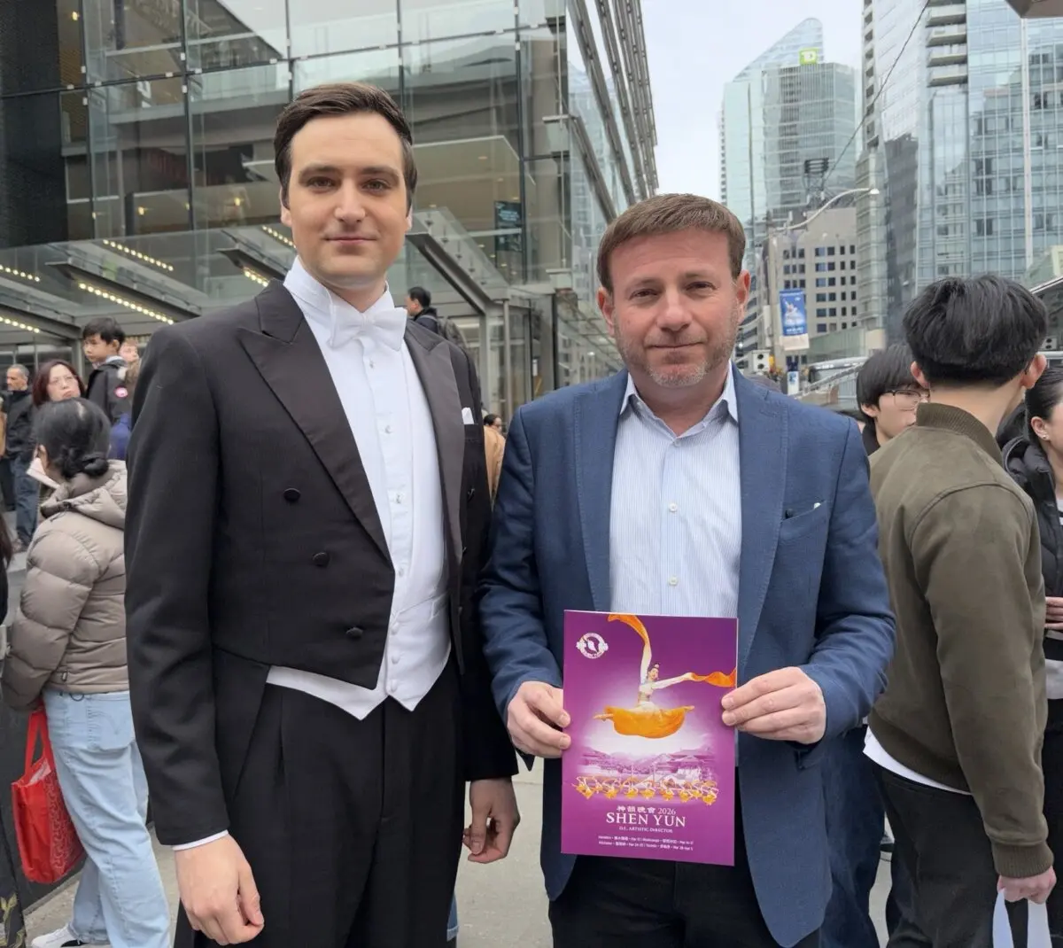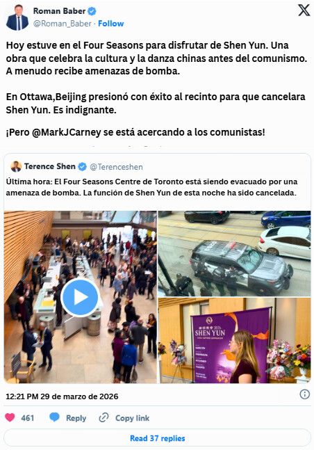El diputado conservador Roman Baber sostiene un programa de Shen Yun junto a uno de los presentadores del espectáculo, frente al Four Seasons Centre for the Performing Arts de Toronto, el 29 de marzo de 2026. (The Epoch Times).Aunque se han producido muchos casos de falsas amenazas de bomba dirigidas contra Shen Yun, no se ha materializado ningún acto de violencia. En uno de los casos más recientes en Canadá, la función de Shen Yun en el Living Arts Centre de Mississauga, el 15 de marzo, se retrasó una hora y media debido a una amenaza de bomba. La Policía Regional de Peel afirmó que la investigación reveló que no se trataba de una amenaza creíble.