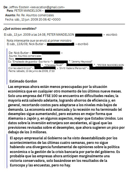 En junio de 2009, Mandelson parece haberle pasado a Epstein una evaluación interna de un “plan de venta de activos”, al que Mandelson se refiere como una “nota interesante que ha llegado al primer ministro”.