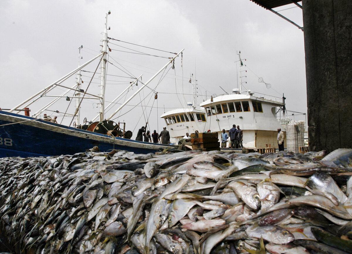 Vista de los peces incautados en el puerto de Abiyán, Costa de Marfil, procedentes de dos barcos chinos, el "Far East I" y el "Far East II", que fueron interceptados en diciembre de 2007 por pescar con redes de arrastre de fondo, incumpliendo las leyes nacionales de pesca. (Kambou Sia/AFP a través de Getty Images).El comentarista de actualidad con sede en China Xu Zhen declaró a The Epoch Times que, debido al historial de encubrimiento del PCCh, resulta muy engañoso que este utilice barcos pesqueros o mercantes para llevar a cabo misiones militares en una zona gris, como cortar cables submarinos.
