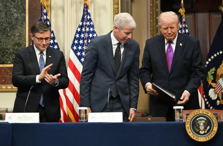 (De izquierda a derecha) El presidente de la Cámara de Representantes, Mike Johnson, el secretario de Energía, Chris Wright, y el presidente Donald Trump en el edificio ejecutivo Eisenhower, en el recinto de la Casa Blanca, el 4 de marzo de 2026. (Andrew Caballero-Reynolds/AFP a través de Getty Images)La incertidumbre sobre esta arteria vital ha contribuido al aumento de los precios de la energía esta semana.