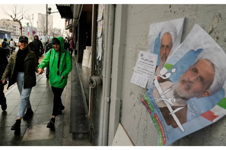 Las mujeres pasan junto a los carteles electorales del ayatolá Alireza Arafi, candidato a las próximas elecciones altamente examinadas por el Estado de la Asamblea de Expertos, en Teherán, Irán, el 21 de febrero de 2024. (Foto AP/Vahid Salemi)Los detentadores del poder