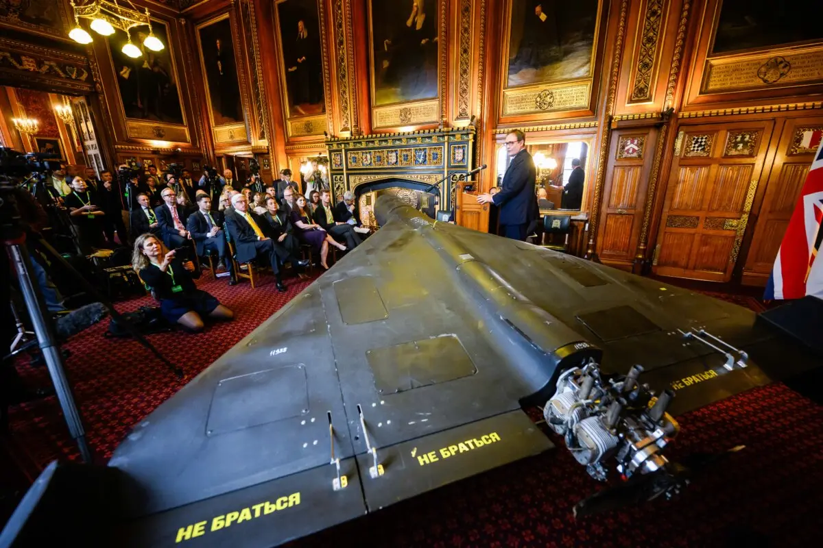 Tom Tugendhat, diputado por Tonbridge, se dirige a los invitados junto al dron de ataque Shahed-136 de fabricación iraní, utilizado por Rusia en Ucrania, en el Parlamento de Londres, el 14 de octubre de 2025. (Leon Neal/Getty Images)Zelenski afirmó que había encargado al ministro de Asuntos Exteriores, al ministro de Defensa, al mando militar, a las agencias de inteligencia y al secretario del Consejo de Seguridad Nacional y Defensa "que presentaran opciones para ayudar a los países pertinentes y que prestaran ayuda de forma que no se debilitara nuestra propia defensa aquí en Ucrania".