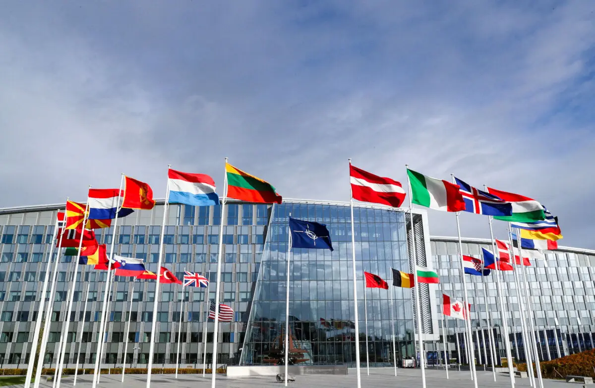 Banderas ondeando frente a la sede de la OTAN antes de una reunión de los ministros de Defensa de la alianza en Bruselas el 21 de octubre de 2021. (Pascal Rossignol/Reuters)Chung afirmó que los países europeos ahora están "centrados exclusivamente en hacer negocios con China".