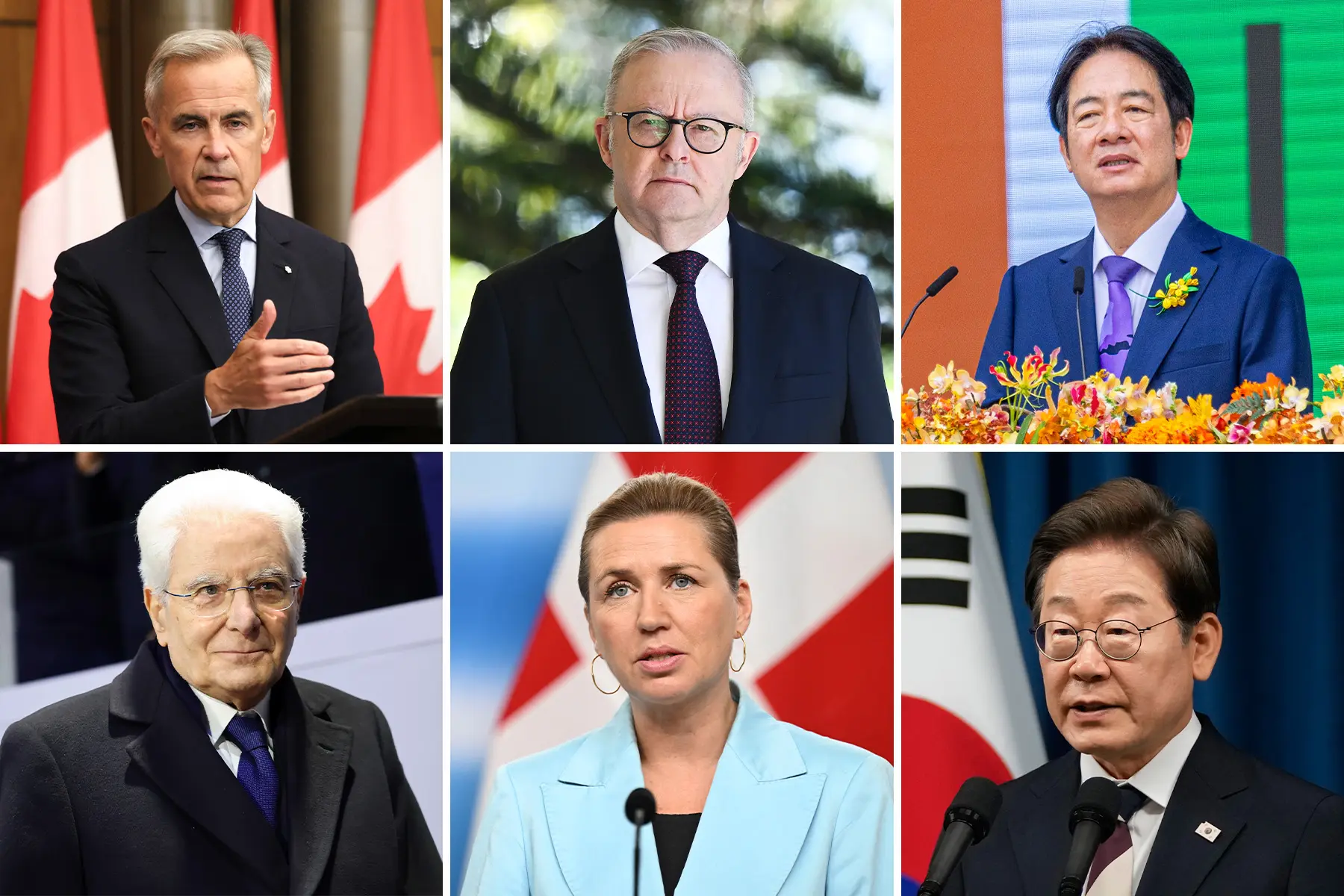 (Arriba, de izq. a der.) El primer ministro canadiense, Mark Carney; el primer ministro australiano, Anthony Albanese; el presidente taiwanés, Lai Ching-te. (Abajo, de izq. a der.) El presidente italiano, Sergio Mattarella; la primera ministra danesa, Mette Frederiksen; el presidente surcoreano, Lee Jae-myung. (Recopilación de La Gran Época, Getty Images)."Si insisten en seguir adelante con la función de Shen Yun, algo le pasará al primer ministro canadiense", se lee en un correo electrónico del 10 de febrero obtenido por The Epoch Times. "Si no les importa la seguridad personal de Mark Carney ni la de todos los altos funcionarios canadienses, entonces sigan adelante con la función".