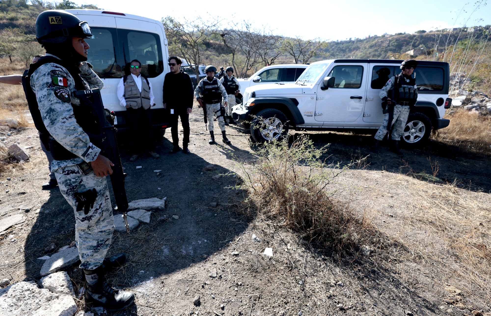 Agentes de la Guardia Nacional de México montan guardia durante una operación para localizar y recuperar los restos humanos de personas desaparecidas, localizados por miembros del colectivo "Guerreros Buscadores" mientras buscaban a sus familiares en un barranco conocido como "El Potrero" en Zapopan, Jalisco, México, el 13 de enero de 2025. (ULISES RUIZ/AFP vía Getty Images)Horacio Rodríguez Jiménez, coordinador nacional de Misión Rescate México, por su parte, instó a las autoridades gubernamentales y municipales a ir más allá y prevenir el delito con la construcción de una cultura de paz en la sociedad a través de cinco estrategias.