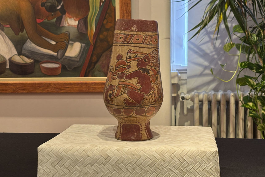 La Embajada de México en Lisboa recibió este jueves de las autoridades de Portugal tres piezas arqueológicas precolombinas de gran valor que fueron detectadas en el país europeo y que fueron sacadas ilegalmente del territorio mexicano. (EFE/ Blas Díaz)Otro es un vaso polícromo maya del período clásico (600-900 d.C), proveniente de las Tierras Bajas Mayas, posiblemente del sur de Campeche; y el tercero es una urna de los valles centrales de Oaxaca de la cultura zapoteca, que representa al dios Cocijo, deidad de la lluvia y el trueno, datada entre el 600 y el 1200 d.C.