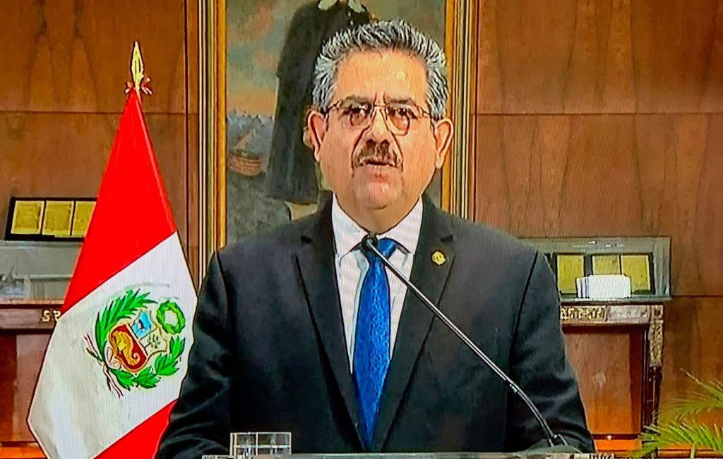 Imagen tomada durante el anuncio de la renuncia del presidente interino peruano, Manuel Merino, en un mensaje televisado desde el Palacio de Gobierno, el 15 de noviembre de 2020. El presidente de Perú, Manuel Merino, renunció el domingo, apenas cinco días después de asumir el cargo, lo que desató una ferviente celebración callejera en Lima, la capital del país, tras las protestas contra su gobierno. (Foto de LUKA GONZALES/AFP vía Getty Images)Con Vizcarra destituido, asumió como presidente interino el congresista de derecha Manuel Merino, quien no pudo resistir la presión popular al conocerse el fallecimiento de dos jóvenes por disparos presuntamente de la Policía durante la represión a las protestas en contra de su llegada al poder.