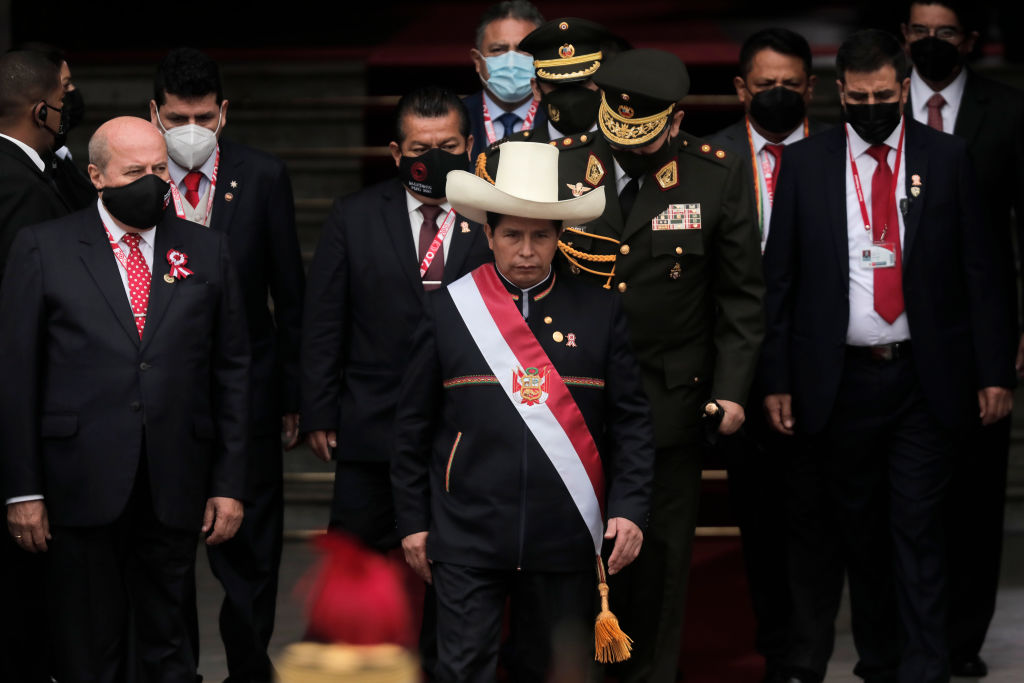 El presidente de Perú, Pedro Castillo, sale del Congreso con la banda presidencial tras la investidura presidencial el 28 de julio de 2021 en Lima, Perú. Castillo, de Perú Libre, derrotó a Keiko Fujimori, de Fuerza Popular, por una ligera diferencia en la segunda vuelta del 6 de junio. Los peruanos también celebraban el bicentenario de su independencia. (Foto de Getty Images/Getty Images)Castillo, quien tampoco contaba con mayoría en el Legislativo, enfrentó siete mociones de destitución durante su mandato, hasta que optó por dar un golpe de Estado el 7 de diciembre de 2022, ordenando cerrar el Congreso e intervenir la Judicatura, que resultó fallido.