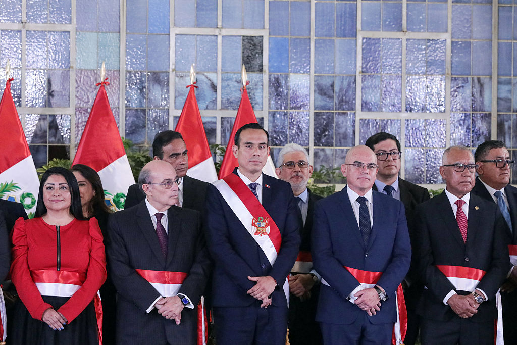 El presidente interino de Perú, José Jerí (centro), posa para una foto familiar con sus nuevos ministros durante la ceremonia de investidura de su gabinete en el Palacio Presidencial de Lima el 13 de octubre de 2025. El nuevo presidente interino de Perú, José Jerí, nombró el martes ministro del Interior a un general retirado que luchó contra Sendero Luminoso, uno de los cargos clave del gobierno de transición. (Foto de CONNIE FRANCE/AFP vía Getty Images)Jerí asumió la presidencia durante cuatro meses, debilitado tras descubrirse reuniones semisecretas con empresarios chinos contratistas del Estado y presuntas irregularidades al contratar a funcionarias que previamente se habían reunido con él en el Palacio de Gobierno.