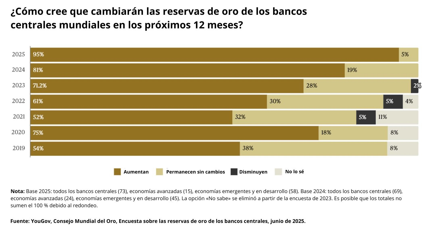 La última encuesta sobre las reservas de oro de los bancos centrales, publicada este verano, reveló que el 95 por ciento de los encuestados cree que las reservas de los bancos centrales mundiales aumentarán en los próximos 12 meses.