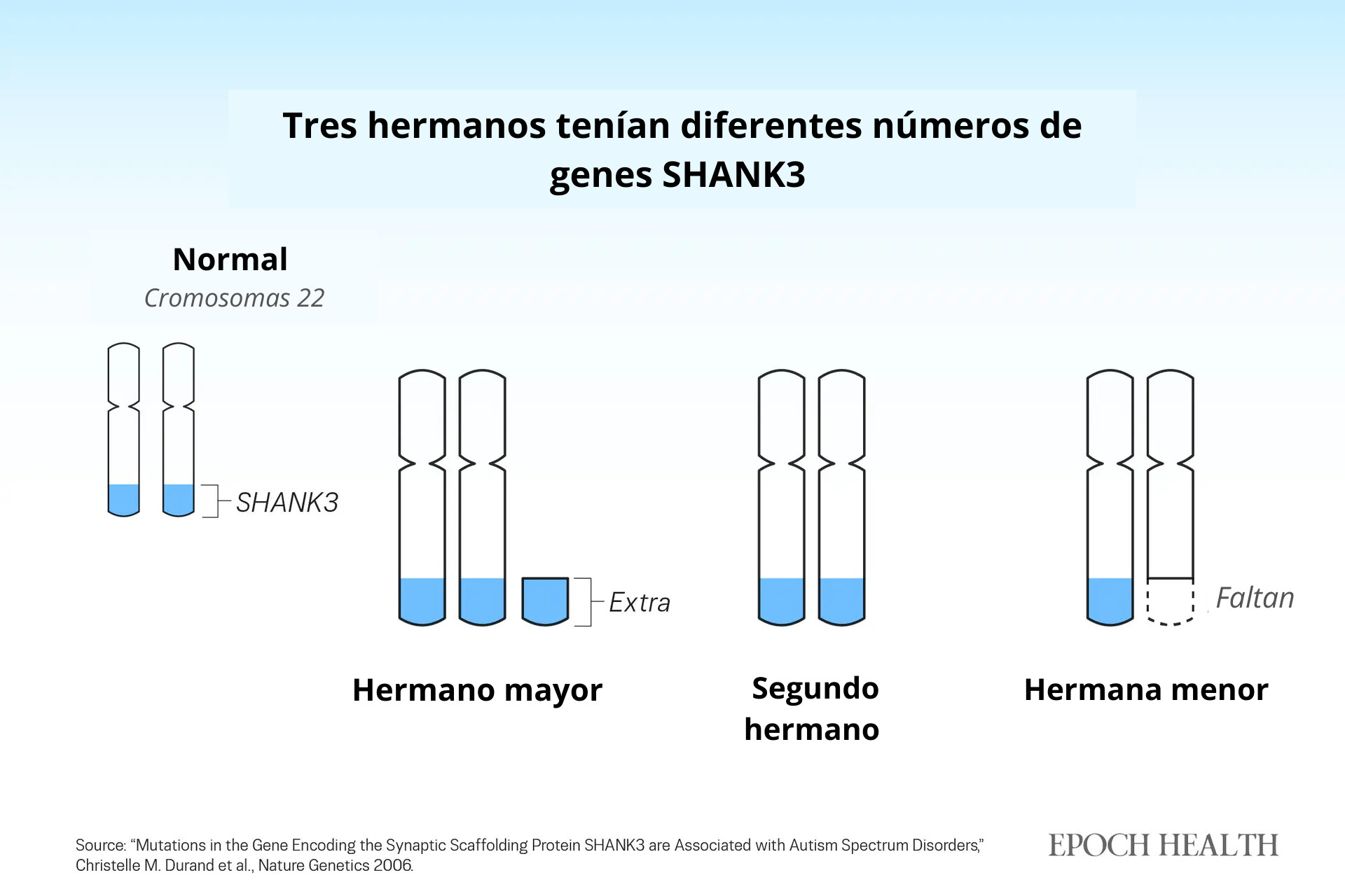 El gen SHANK3 se encuentra en el cromosoma 22. En la historia de los tres niños, el hermano con un desarrollo típico tenía las dos copias normales del gen. El hermano mayor, con autismo leve, heredó un fragmento adicional del cromosoma 22, además de las dos copias normales. La hermana, con autismo severo, solo tenía una copia normal, debido a la falta de un fragmento del cromosoma 22.