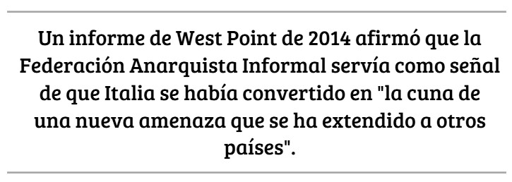 Sin embargo, este tipo de "anarquismo insurreccional... se ha convertido en la forma más peligrosa de terrorismo nacional no yihadista en el país", según el artículo.