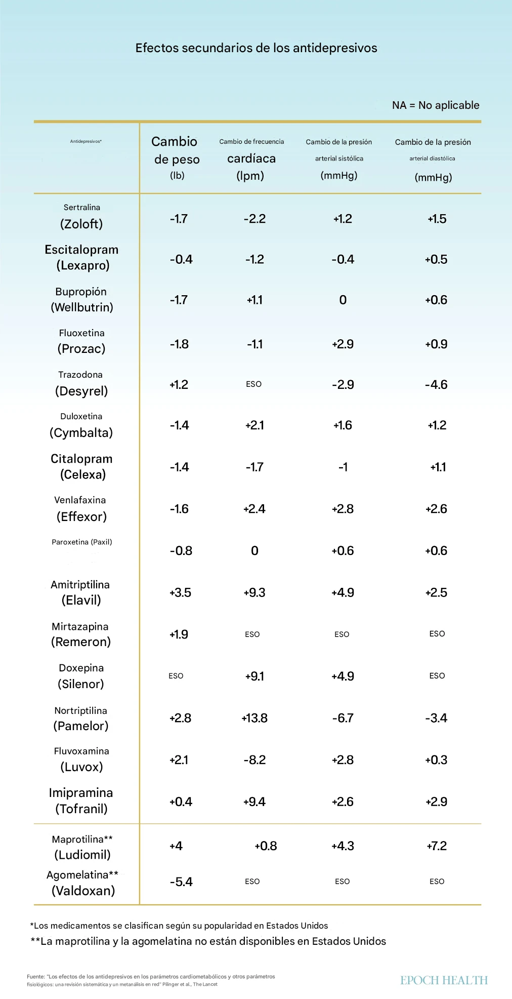"Algunos inhibidores de la recaptación de serotonina y norepinefrina, como la duloxetina y la venlafaxina, provocaron aumentos pequeños pero medibles de la presión arterial y el colesterol, por lo que conviene controlar esos valores de forma periódica".