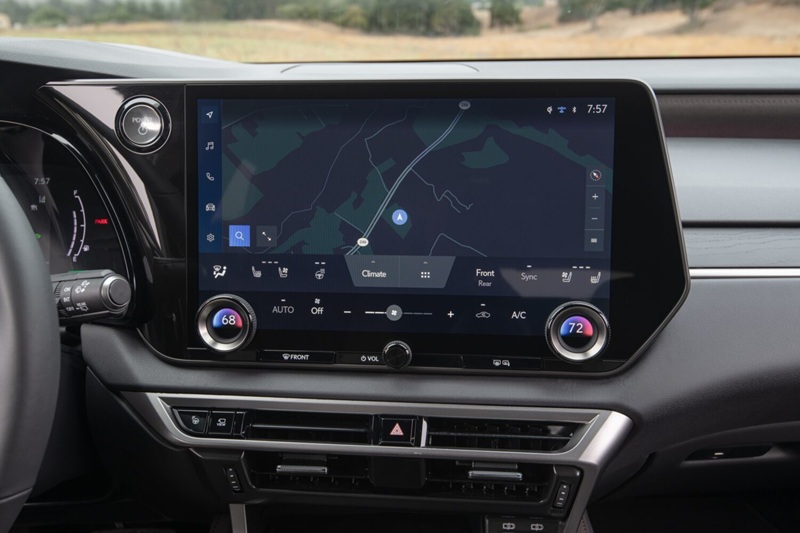 Una pantalla táctil de 9.8 pulgadas o 25 centímetros capta la atención en el centro del tablero, y existe la opción de una aún más grande de 14 pulgadas o 35 centímetros, en un conjunto que, si bien no armoniza bien con el entorno, sí realza el lujo de la cabina. La pantalla está ligeramente inclinada hacia el conductor y utiliza la última interfaz de software de Lexus, lo que evidentemente es una progresión sustancial respecto de sistemas anteriores, sobre todo de aquellos que teníamos que manejar mediante un incómodo procedimiento similar a una almohadilla de computadora.