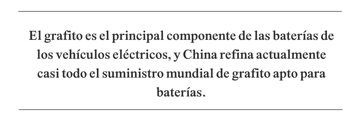 En Suecia, la mina de grafito de Woxna permanece en espera, pero se necesitaría una importante inversión para reiniciar su actividad. El grafito es el principal componente de las baterías de los vehículos eléctricos, y China refina actualmente casi todo el suministro mundial de grafito apto para baterías.