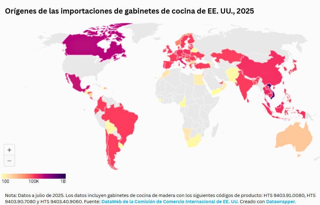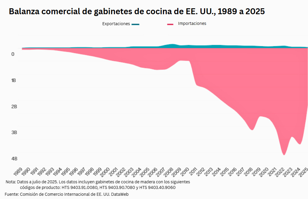 El aumento de las importaciones de armarios de cocina arrebató más de 4 mil millones de dólares en cuota de mercado a los productores estadounidenses en 2022, según un informe de la Coalición para una América Próspera. Solo el déficit comercial en armarios de cocina creció hasta los 3.7 mil millones de dólares en 2024.