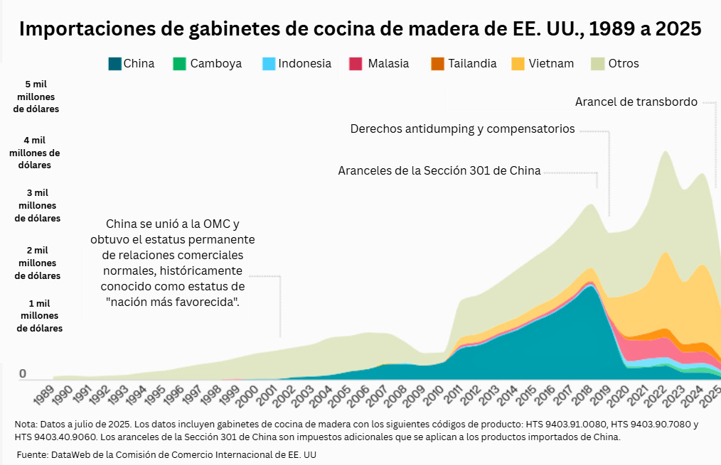 Del mismo modo, las importaciones de armarios de cocina chinos a Estados Unidos crecieron exponencialmente, alcanzando los 1.7 mil millones de dólares en 2018, según datos de la Comisión de Comercio Internacional.