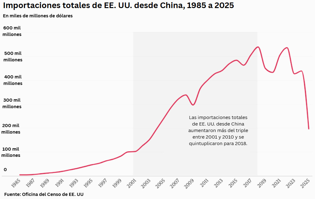 En 2010, China se convirtió en el primer exportador mundial de todos los productos. Las importaciones totales procedentes de China se triplicaron con creces entre 2001 y 2010 y se quintuplicaron en 2018, según la Oficina del Censo.