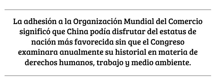 China había disfrutado del estatus de nación más favorecida desde 1980, pero ese estatus tenía que ser revisado y renovado cada año mediante una votación del Congreso. La adhesión a la OMC significaba que China podía disfrutar del estatus de nación más favorecida sin que el Congreso examinara anualmente su historial en materia de derechos humanos, trabajo y medio ambiente.