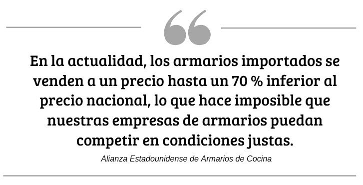 En una carta del 19 de septiembre, la Alianza Estadounidense de Armarios de Cocina (AKCA) instó a la administración Trump a tomar medidas "para salvar la industria estadounidense de armarios, valorada en 14 000 millones de dólares y más de 250,000 puestos de trabajo en el sector manufacturero antes de que sea demasiado tarde".