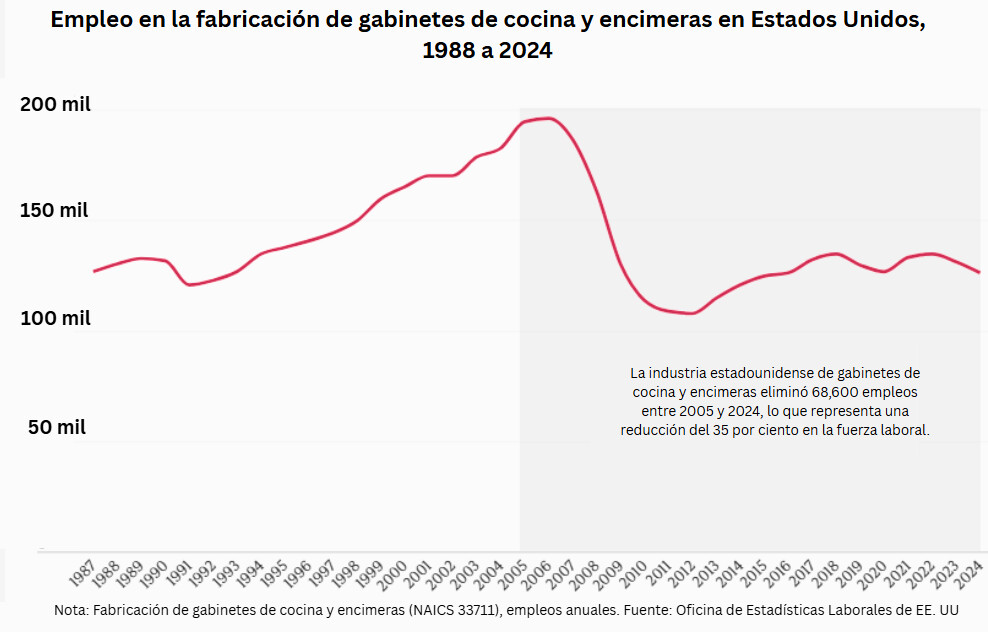 En Estados Unidos, el sector de la fabricación de armarios de cocina y encimeras perdió 68,600 puestos de trabajo entre 2005 y 2024, según la Oficina de Estadísticas Laborales.
