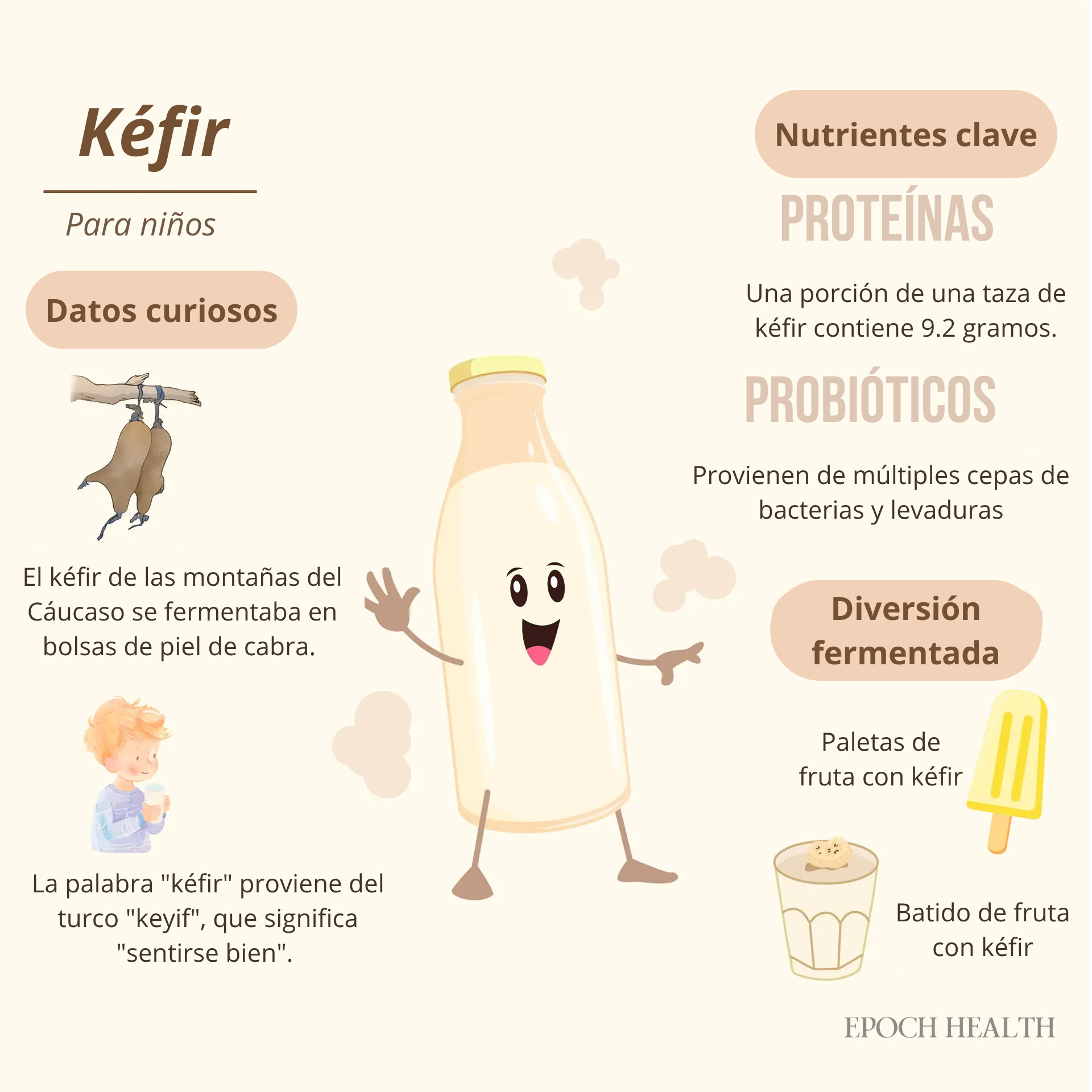 El kéfir es una buena opción para niños en crecimiento porque aporta calcio y vitamina D para huesos y dientes fuertes, además de grasas saludables para el desarrollo del cerebro y del sistema nervioso.