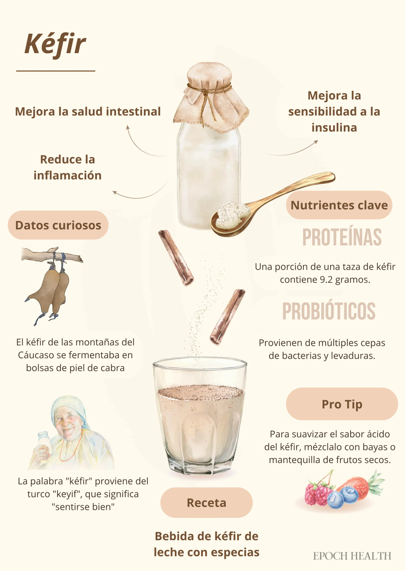 El kéfir se elabora tradicionalmente con leche de vaca, oveja o cabra, aunque también puede hacerse con leche vegetal, agua de coco o agua simple. Se prepara fermentando la leche o el agua saborizada con granos de kéfir, que son agrupaciones de bacterias y levaduras que conviven en simbiosis. El resultado es una bebida ácida y ligeramente espumosa.La siguiente receta que incorpora kéfir es cortesía de Sheridan Genrich, nutricionista clínico, naturópata y redactora de salud de The Epoch Times.