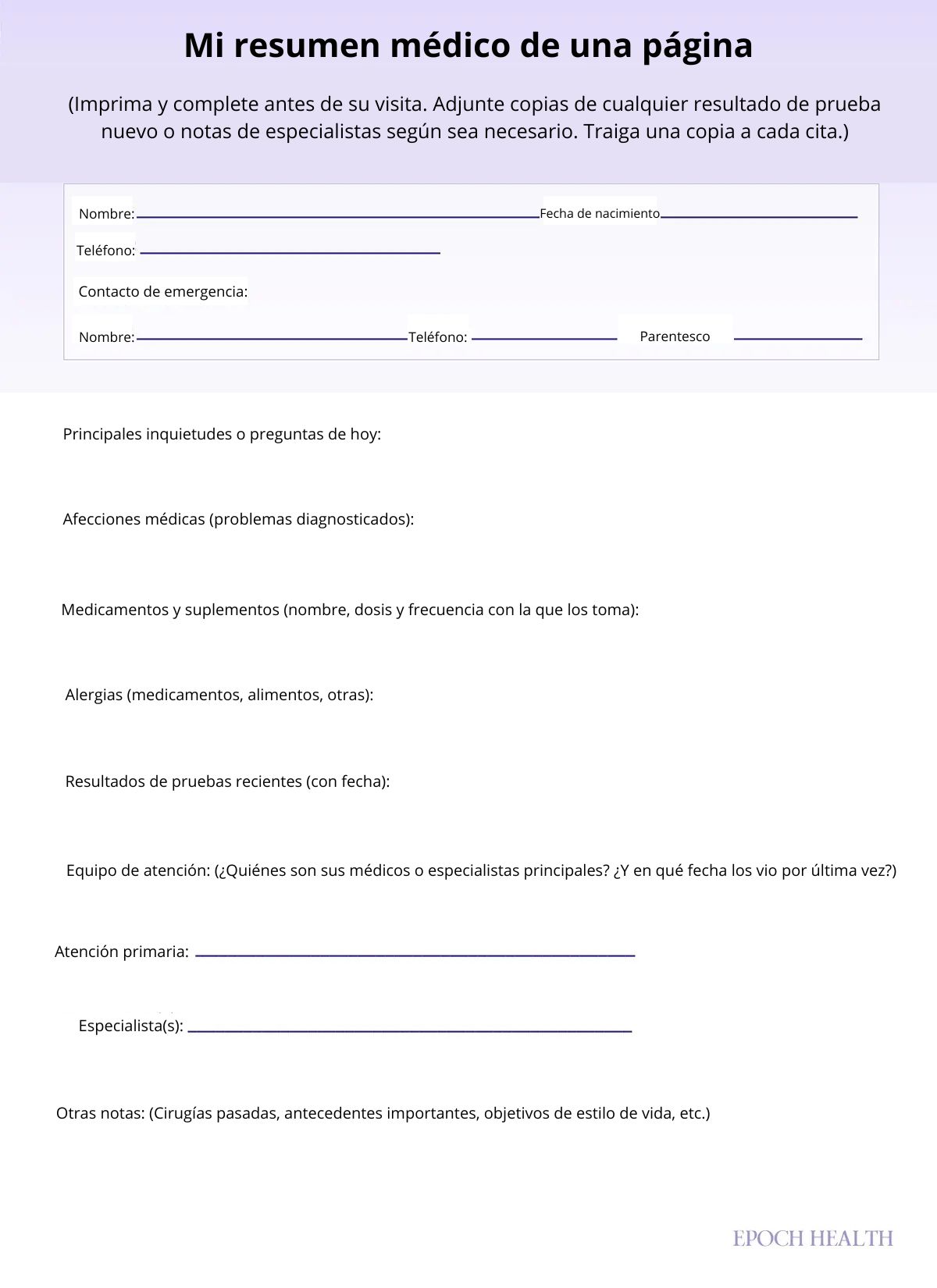 Piense en su historial médico como si fuera un currículum. Destaque lo que es importante y sea conciso.