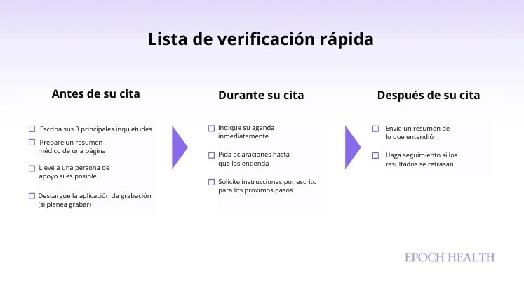 "Traiga una lista con las tres cosas más importantes y compártalas de inmediato", dijo el Dr. Marc Lato, médico de familia y defensor de los pacientes, a The Epoch Times. Los primeros minutos son los más importantes. Plantee sus prioridades al principio, antes de que la visita tome otro rumbo.