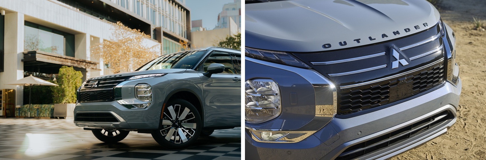 El diseño futurista frontal capta la atención y el propio fabricante afirma que el objetivo del exterior de Outlander es lograr una “presencia impresionante”. La parte delantera cuenta con una gran parrilla negra, similar a la que se muestra en algunas camionetas, lo que le confiere un gran peso visual, rematada en los flancos por grandes faros que le imprimen un aspecto algo abultado y sobredimensionado, en contraste con los detalles cromados afilados.