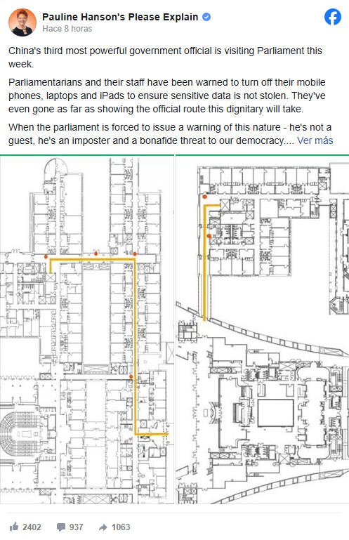 "Puede haber interrupciones intermitentes en el acceso a la red wifi durante los periodos indicados anteriormente. En las zonas identificadas, los dispositivos conectados a Internet, incluidos teléfonos, tabletas y ordenadores portátiles, deben apagarse", según las instrucciones publicadas por la líder de One Nation, Pauline Hanson, en su Facebook.