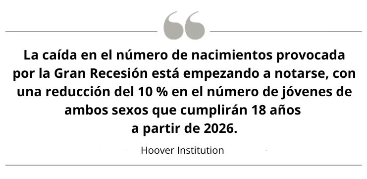 "La caída de la natalidad causada por la Gran Recesión está empezando a notarse, con una reducción del 10 % en el número de jóvenes elegibles que cumplirán 18 años a partir de 2026", dice un análisis de la Hoover Institution publicado en enero.