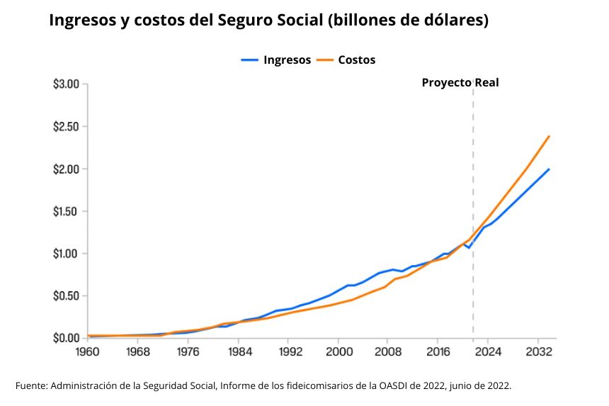 Los economistas y la Administración de la Seguridad Social llevan años advirtiendo que el aumento del número de beneficiarios y la disminución del número de contribuyentes al programa lo harán insolvente. La Fundación Peter G. Peterson, en un informe de 2022, dice que, para 2034, los costos de la Seguridad Social superarán los ingresos de la Seguridad Social en 437,000 millones de dólares.