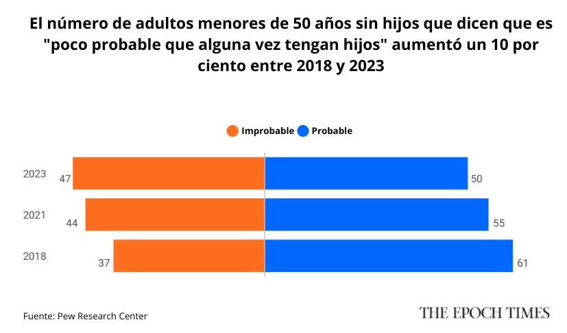 Además, algunas pruebas sugieren que los adultos no solo están esperando más tiempo para tener hijos, sino que muchos están renunciando por completo a la paternidad. Un estudio de Pew de 2024 informa que el número de adultos menores de 50 años sin hijos que dicen que "probablemente nunca tendrán hijos" aumentó un 10 % entre 2018 y 2023.