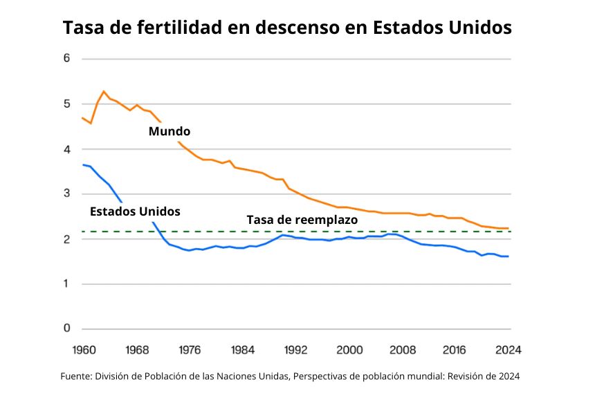 Mientras tanto, la tasa de fertilidad general —el número de nacidos vivos por cada 1000 mujeres en edad fértil— ha caído a mínimos históricos. La tasa norteamericana se desplomó de 3.1 en 1950 a 1.6 en 2023, según un análisis del McKinsey Global Institute publicado en enero.