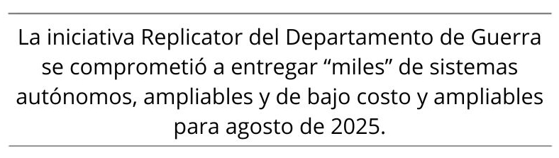 El Departamento de Defensa a través de la iniciatica Replicator, lanzada en agosto de 2023, se comprometió a entregar "varios miles" de sistemas autónomos de bajo costo y ampliables para agosto de 2025, presionando a las fuerzas armadas a adquirirlos con mayor rapidez y en grandes cantidades.