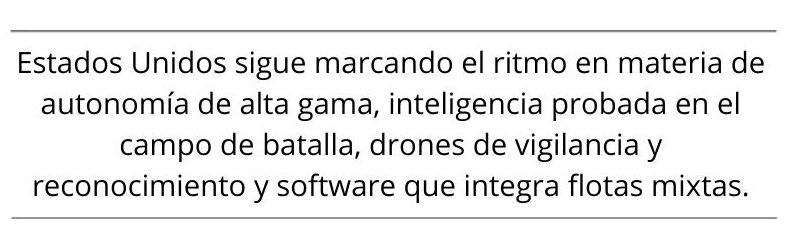 Estados Unidos sigue marcando la pauta en autonomía de alta gama, inteligencia, vigilancia y reconocimiento de eficacia probada en el campo de batalla; drones de ataque; y software que integra flotas mixtas. Su principal obstáculo es convertir la innovación rápida en producción a escala industrial, precisamente lo que iniciativas como Replicator, el programa de Aviones de Combate Colaborativo y Blue UAS pretenden solucionar, explicó Cao.