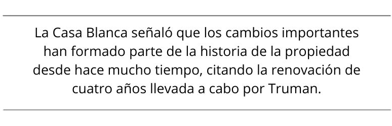 La Casa Blanca emitió una declaración el 21 de octubre, señalando que los cambios extensos han sido parte de la historia de la propiedad durante mucho tiempo, citando como ejemplo el proyecto de cuatro años de Truman en el que desmanteló y reconstruyó completamente el interior después de determinar que el edificio era estructuralmente débil.