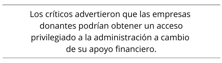 Entre los donantes destacados se incluyen Amazon, Apple, Google, Caterpillar Inc., HP Inc., Lockheed Martin, Meta Platforms, Microsoft y Palantir Technologies, entre muchos otros.