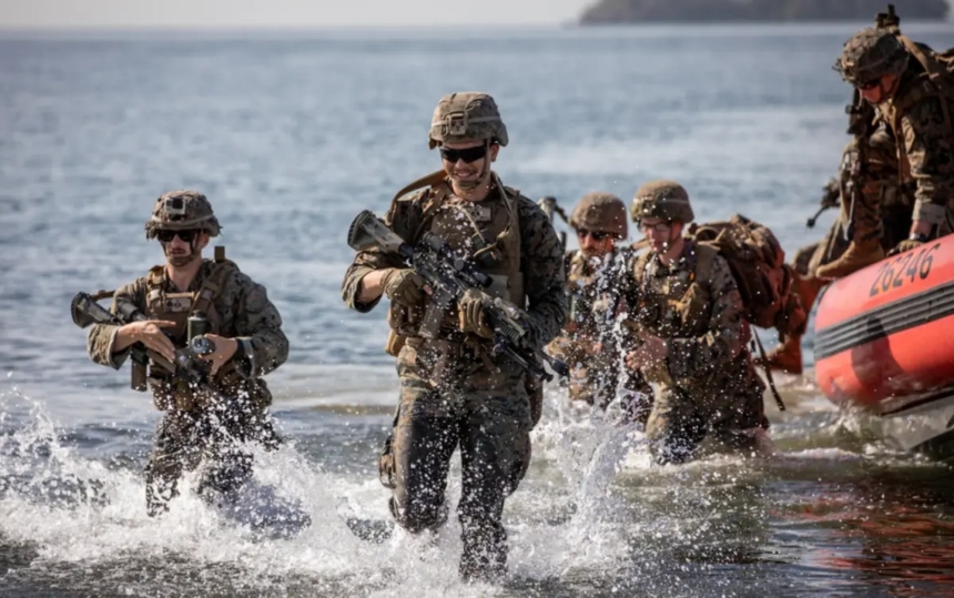 Los marines estadounidenses realizan un ejercicio de asalto anfibio durante el perfil de misión completo combinado y multidominio de TRADEWINDS 25 (TW25) en Chaguaramas, Trinidad y Tobago, el 7 de mayo de 2025. (Foto del Ejército de Estados Unidos por el sargento John Russell)
