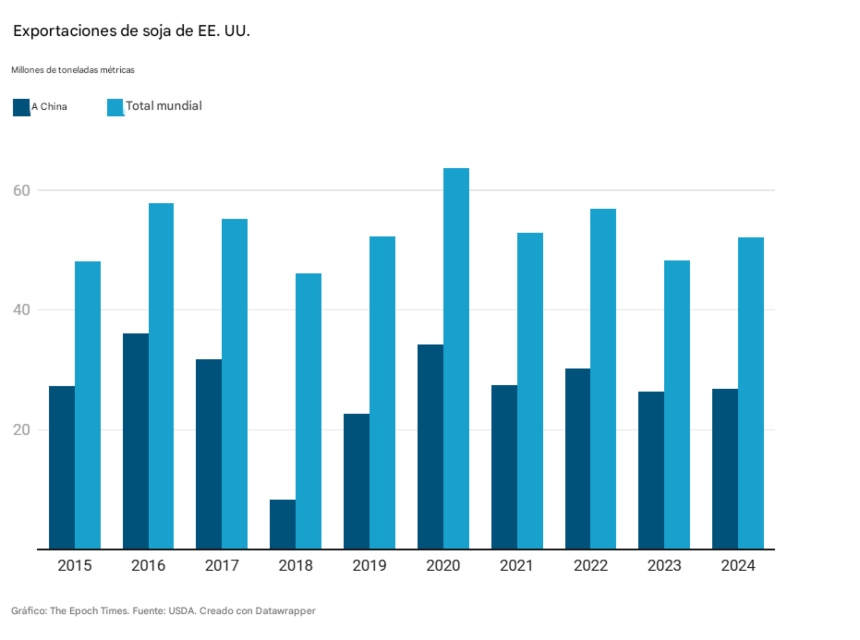 En 2024, China compró 26.8 millones de toneladas métricas de soja estadounidense, por valor de 12,600 millones de dólares, pero el régimen dejó de comprar soja estadounidense después de que Estados Unidos aumentara los aranceles sobre los productos chinos para obligar a Beijing a tomar medidas sobre el control del fentanilo.