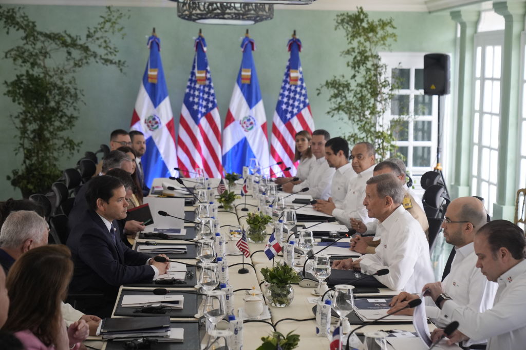 El secretario de Estado estadounidense, Marco Rubio (izquierda), asiste a una reunión con el ministro de Relaciones Exteriores de la República Dominicana, Roberto Álvarez (derecha), en el Palacio Nacional de Santo Domingo, República Dominicana, el 6 de febrero de 2025. (Foto de Mark Schiefelbein / POOL / AFP) (Foto de MARK SCHIEFELBEIN/POOL/AFP vía Getty Images)