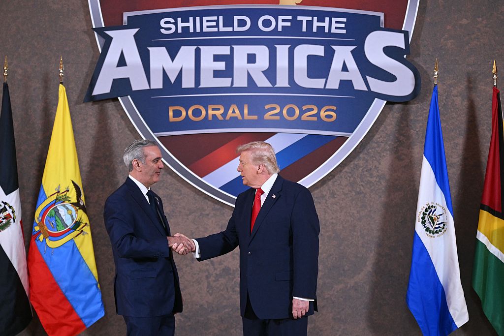 El presidente de Estados Unidos, Donald Trump saluda al presidente de la República Dominicana, Luis Abinader (izquierda), al inicio de la Cumbre "Escudo de las Américas" en el Trump National Doral de Miami, Florida, el 7 de marzo de 2026, en la que una docena de líderes de derecha de América Latina y el Caribe debatieron temas sobre la región, desde el crimen organizado hasta la inmigración ilegal. (Foto de SAUL LOEB / AFP vía Getty Images)Entre la inercia y la decisión